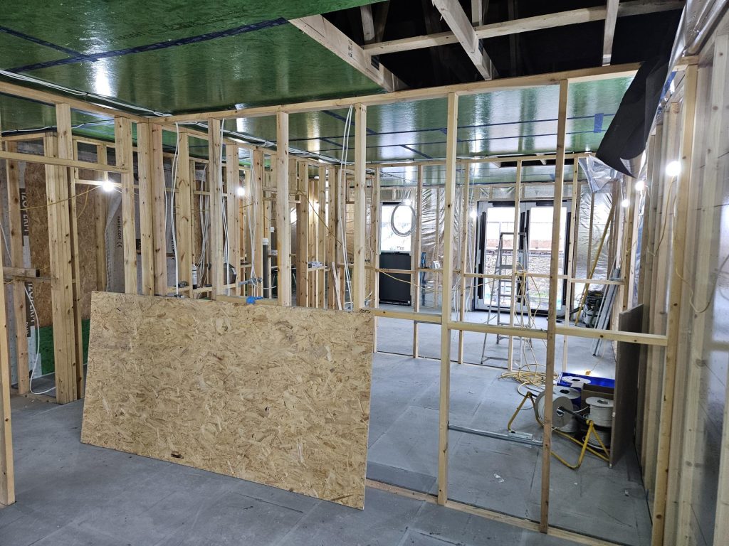 Great progress has been made on site with both blocks now water-tight and first fix works moving along nicely. Smartply airtightness boarding is nearing completion to the top floor of Block One, first fix electrics are ongoing in Block Two, and gypsum board and screed board installations are also close to completion.